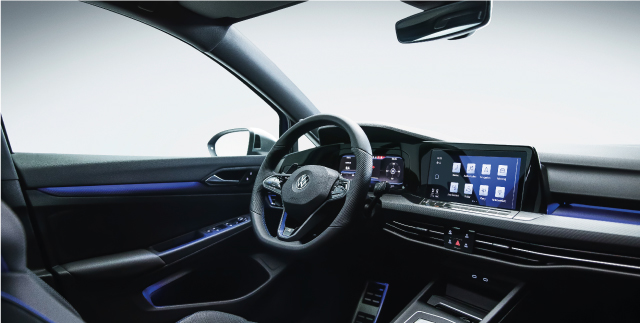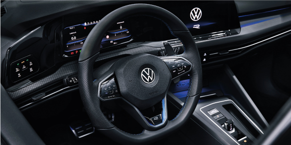 Golf R’ın sürücü odaklı tasarlanmış iç mekanının merkezinde yer alan 10” Dijital Gösterge Paneli “Digital Cockpit Pro”, R Kokpit Modu “R-View” sayesinde yatay hız göstergesi ve vites değiştirme noktaları gibi saf kan yarış otomobillerinin sürücü arabirimlerini ekrana taşır. Aktive etmek için Çok Fonksiyonlu ve Isıtmalı “R” Deri Direksiyonun kapasitif dokunmatik tuş takımı üzerinde bulunan “R” yüzeyine dokunmanız yeterli.